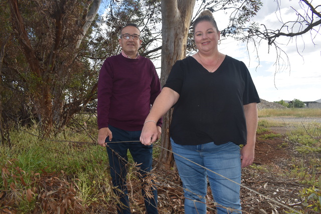 Tony Piccolo MP and local parent Dani Jones holds up the old perimeter fence, which will be replaced with a new fence in time for the new school year. (Jarrad Delaney: 512954)