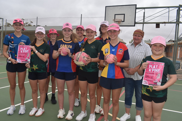 Hummocks and Balaklava club members, and the Gangell family united and ready to ‘Play 4 Pink’. (Back): Bryce Guthberg, Bridget Guthberg, Ashley Williams, Sonja Gangell; (front): Halle Young, Alexa Arthur, Grace Guthberg, Ella Hahesy, Ilka Gangell and Evie Hahesy. (Jarrad Delaney: 516104)