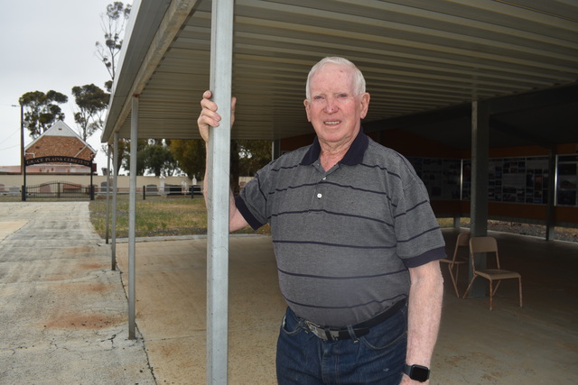Peter March standing under one of the shelters at Moquet Lee, which includes panels detailing the history of Grace Plains and chronicles the Pinery fire. (Jarrad Delaney: 517719)