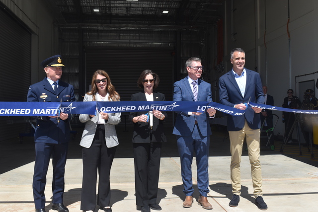 Air Marshal Leon Phillips, Jen McManus (Lockheed Martin vice president production operations), Paula Hartley (Lockheed Martin vice president and general manager, tactical missiles), Minister for Defence Industry Pat Conroy and Premier Peter Malinauskas cut the ribbon to officially open the new factory at Port Wakefield. (Jarrad Delaney: 522728)