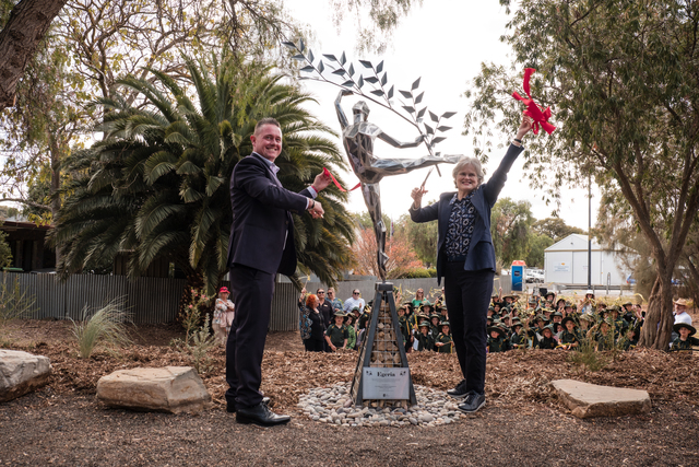 Acting Light Regional Council Mayor Michael Phillips-Ryder and Her Excellency the Hon Frances Adamson AC officially launch the Egeria Sculpture Memorial in Greenock. (Supplied)