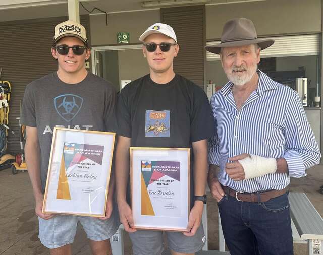 Last year's Flinders Ranges Council Young Citizen of the Year Award winners Lachlan Finlay and Eric Brereton with former Federal Member for Grey Rowan Ramsey - the 2026 Australia Day celebrations will be held again at the Quorn Swimming Pool. (supplied)