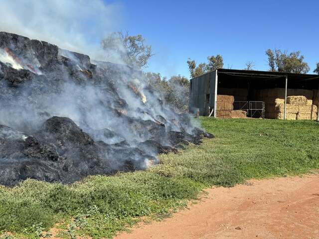 The cause of the fire is suspected to be internal combustion of the hay bales, after recent rains in the area.