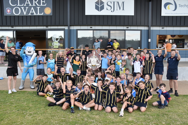 The kids gather with their cricketing heroes, the Adelaide Strikers mascot and the Sheffield Shield for the Stanley Cricket Association season launch. (Harry Mead: 511175)