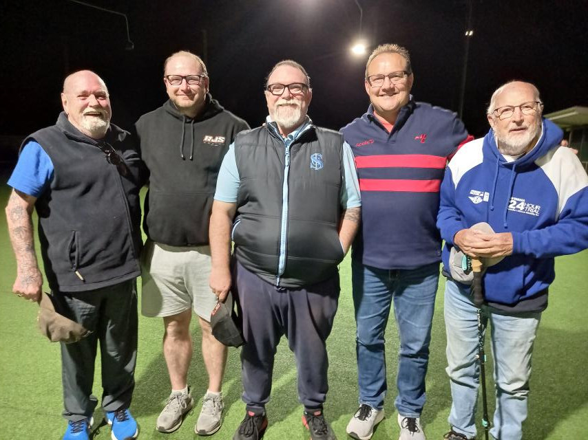 Happy night bowlers Lloyd Wilson, Dwayne Angel, Adam Wilson, Travis Jensen and Ted Bowden. (Supplied)