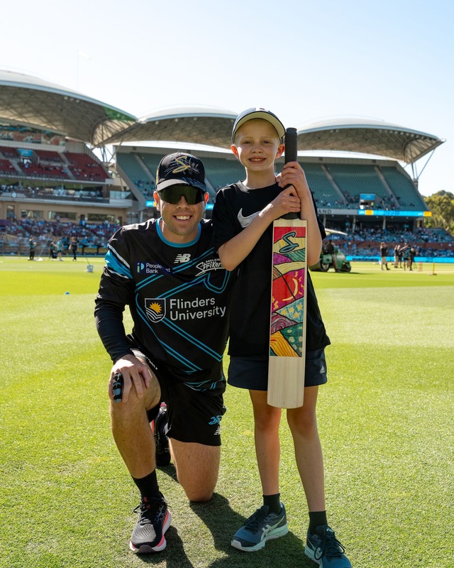 Adelaide Striker Harry Nielsen poses with Braxton McInerney and his winning bat design. (Adelaide Strikers Facebook)